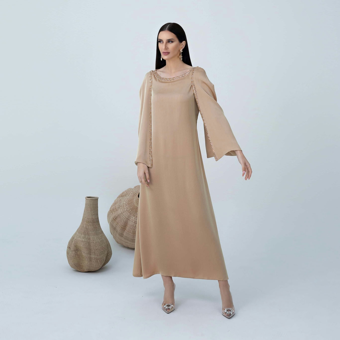 Gold Modern Cape Design Kaftan with Crystals Hand Embroidery Details.