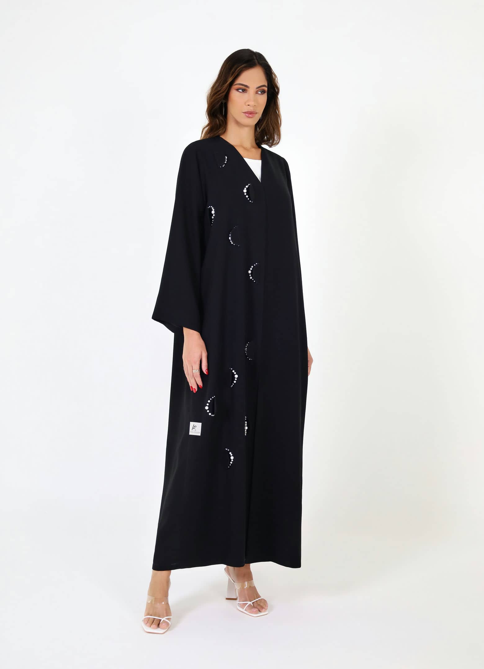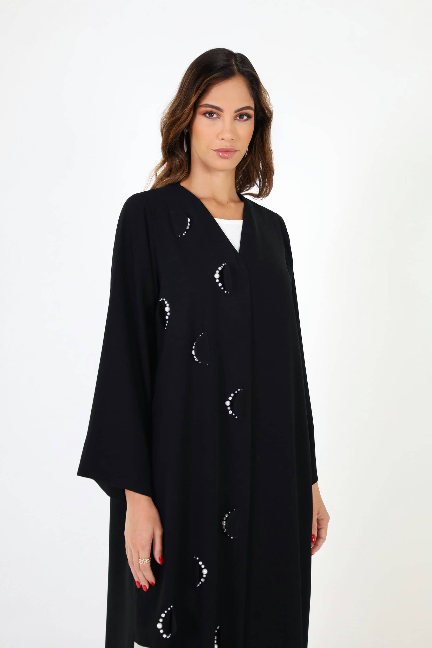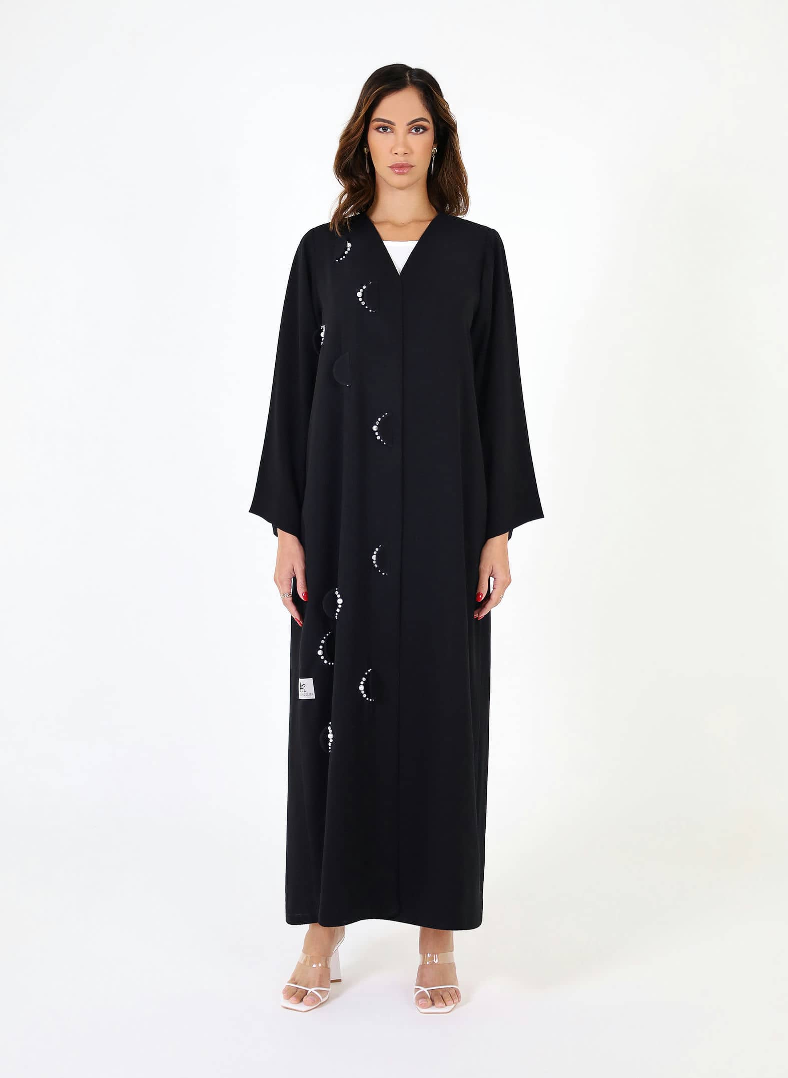 Black Abaya with Off-White Pearl Details on the Front.