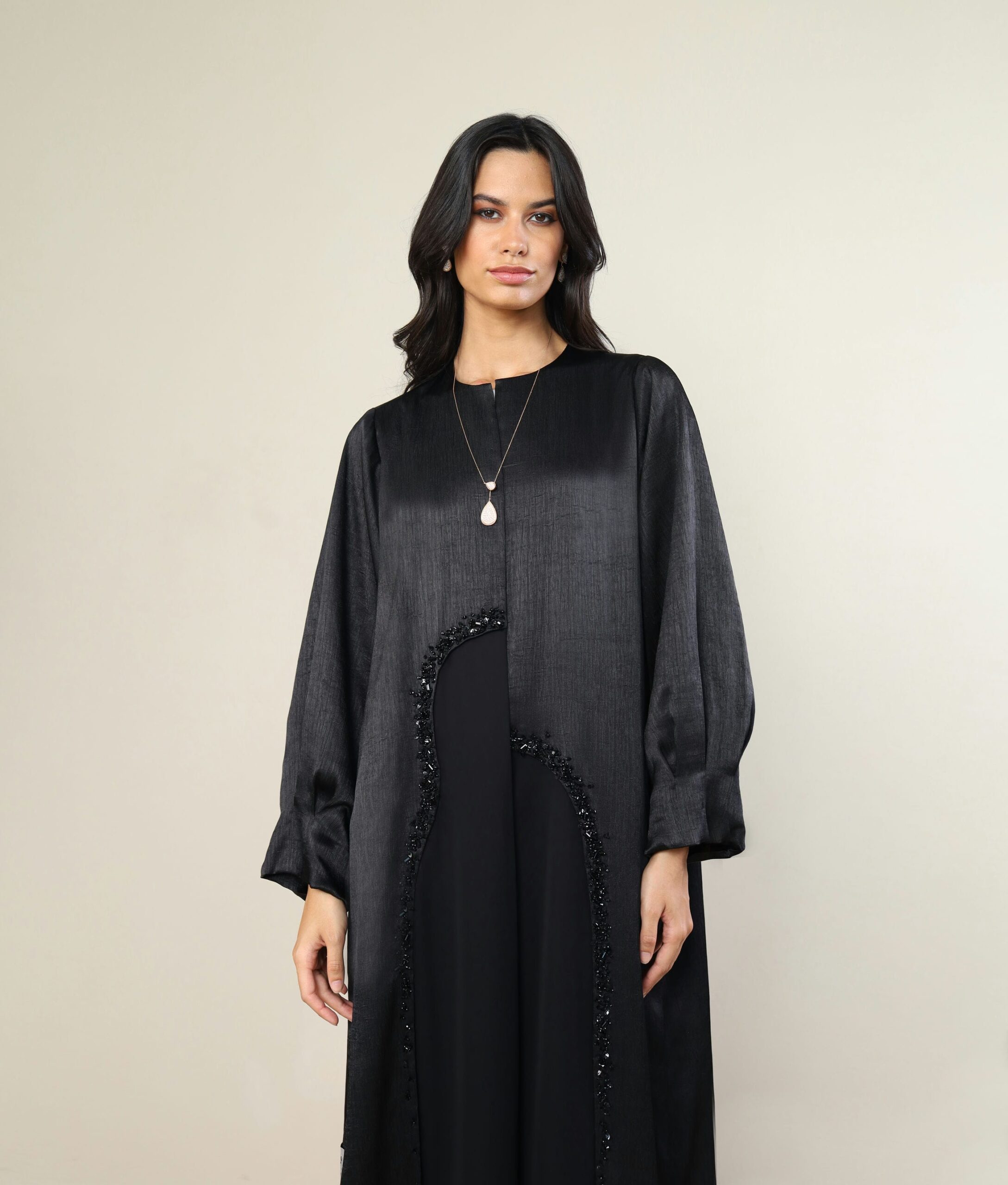 Two Tone Black Abaya with beads embroidery on front and pleats details on both sleeve.