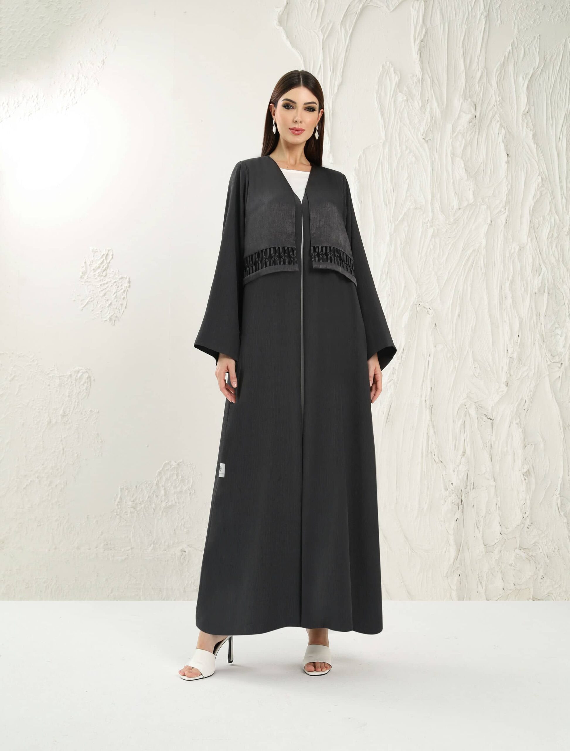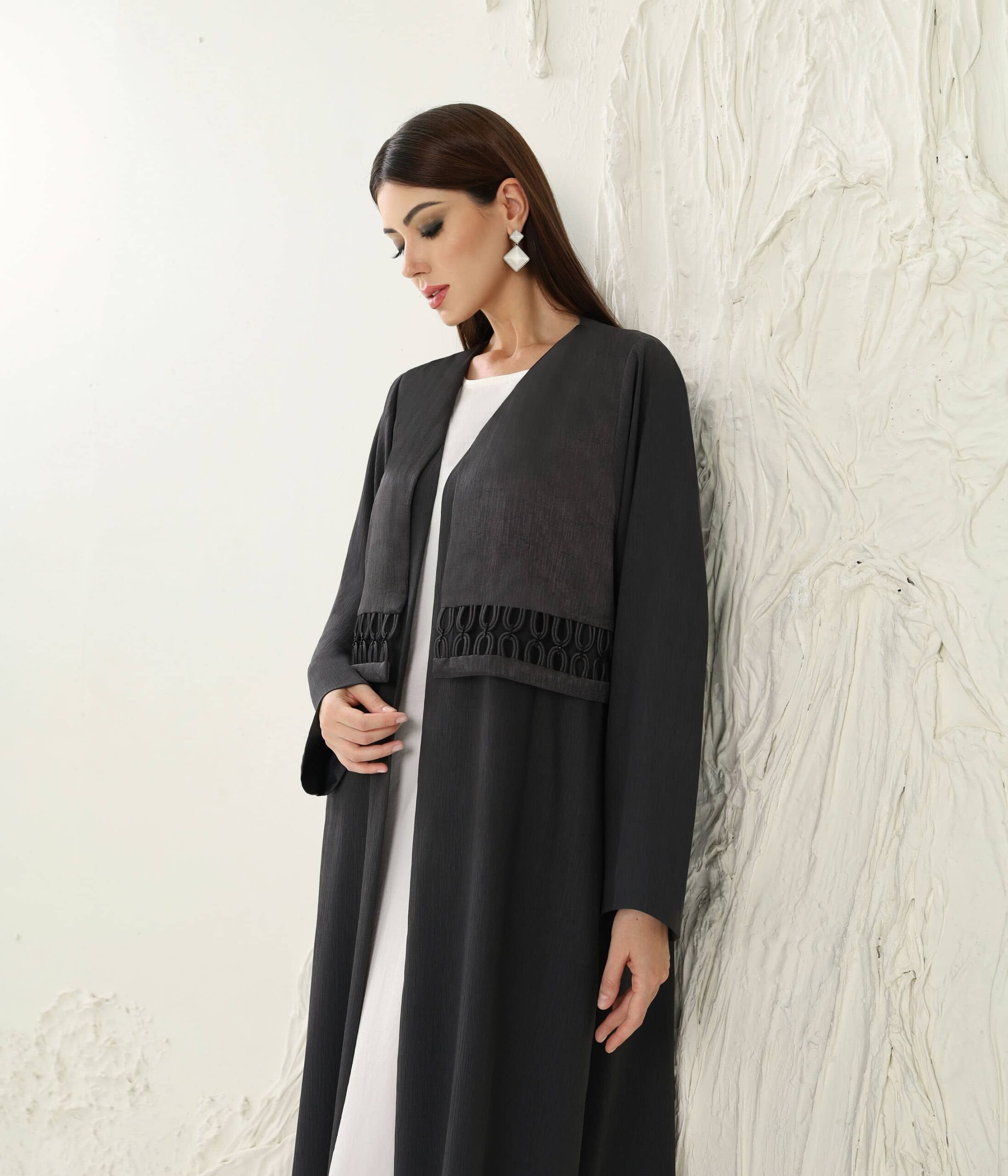 Grey abaya with loops details and crystal embroidery  on front panel.