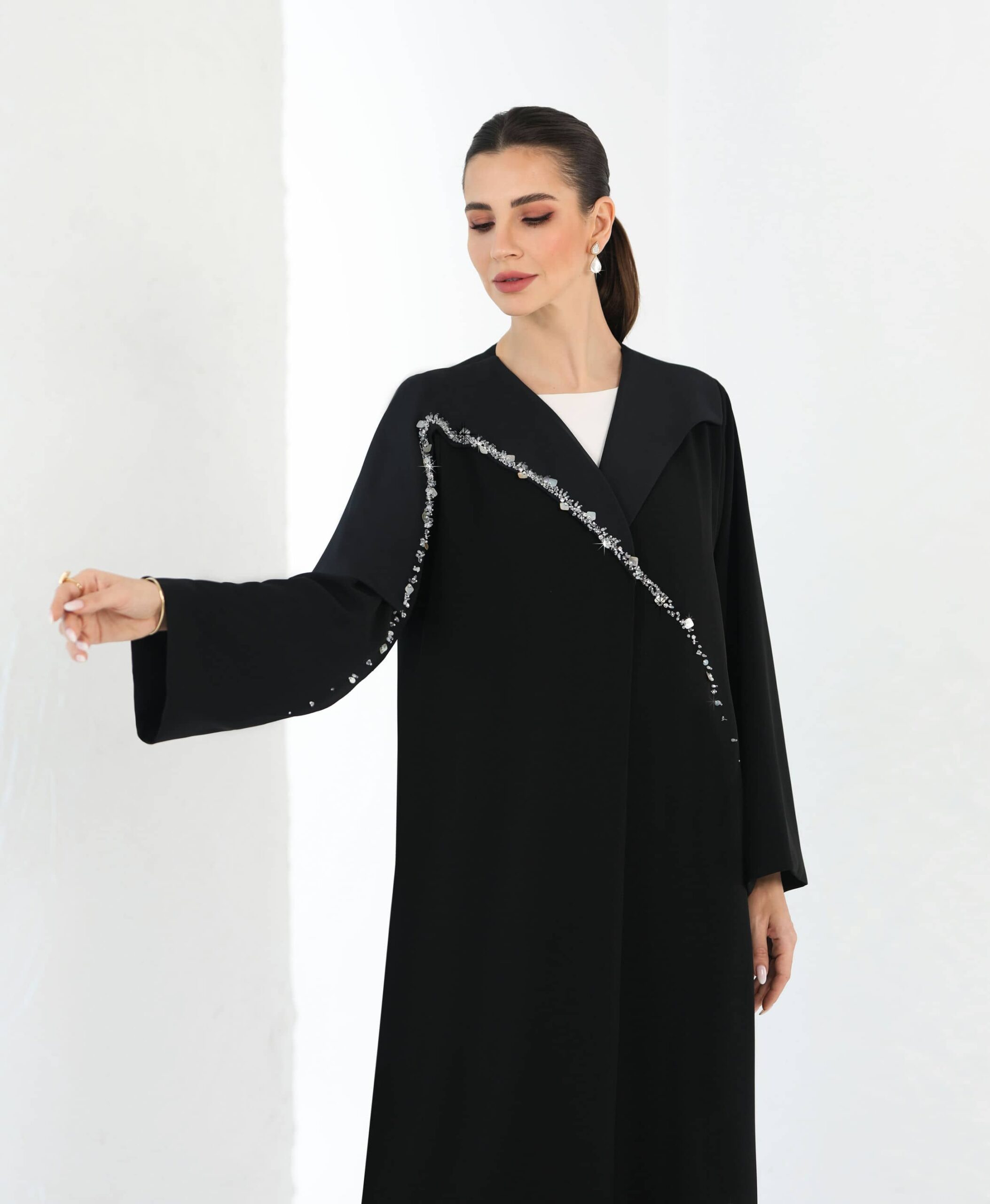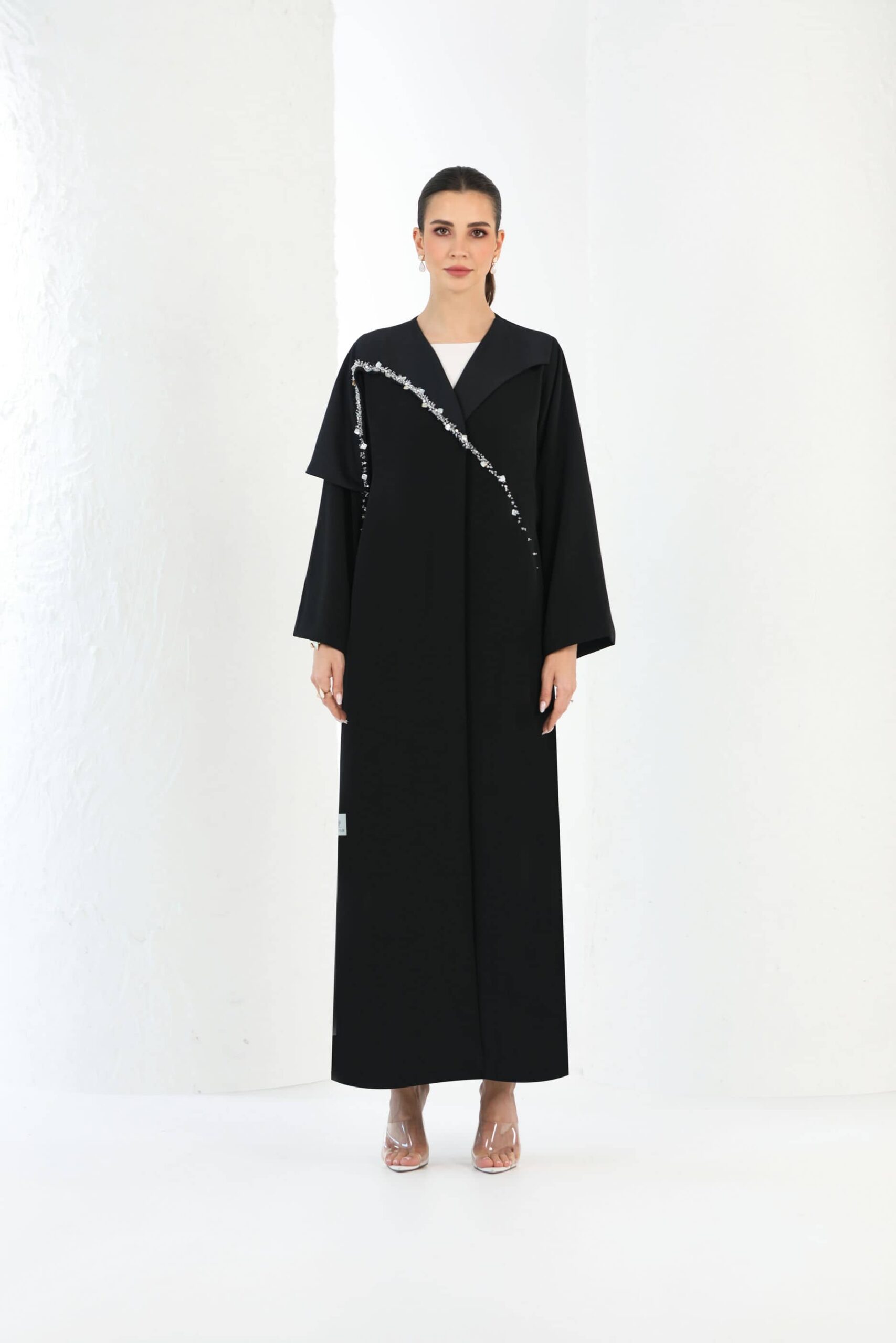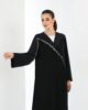 Black abaya with front panel and crystal hand embroidery on front.