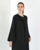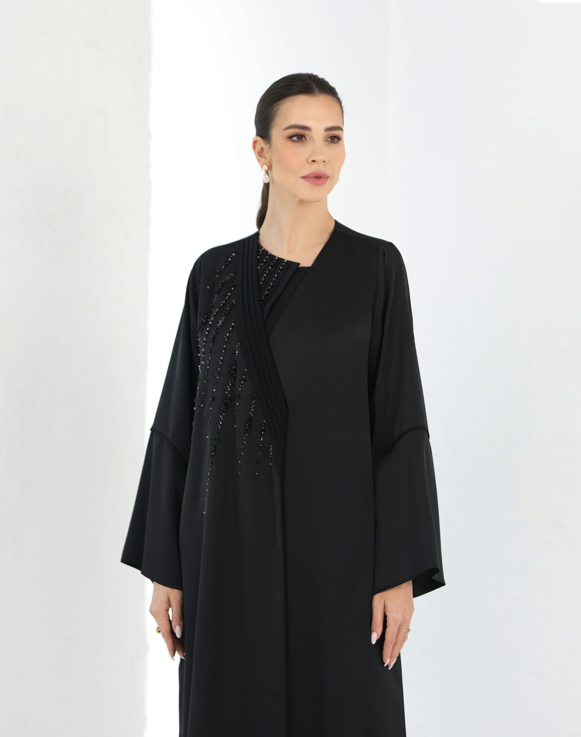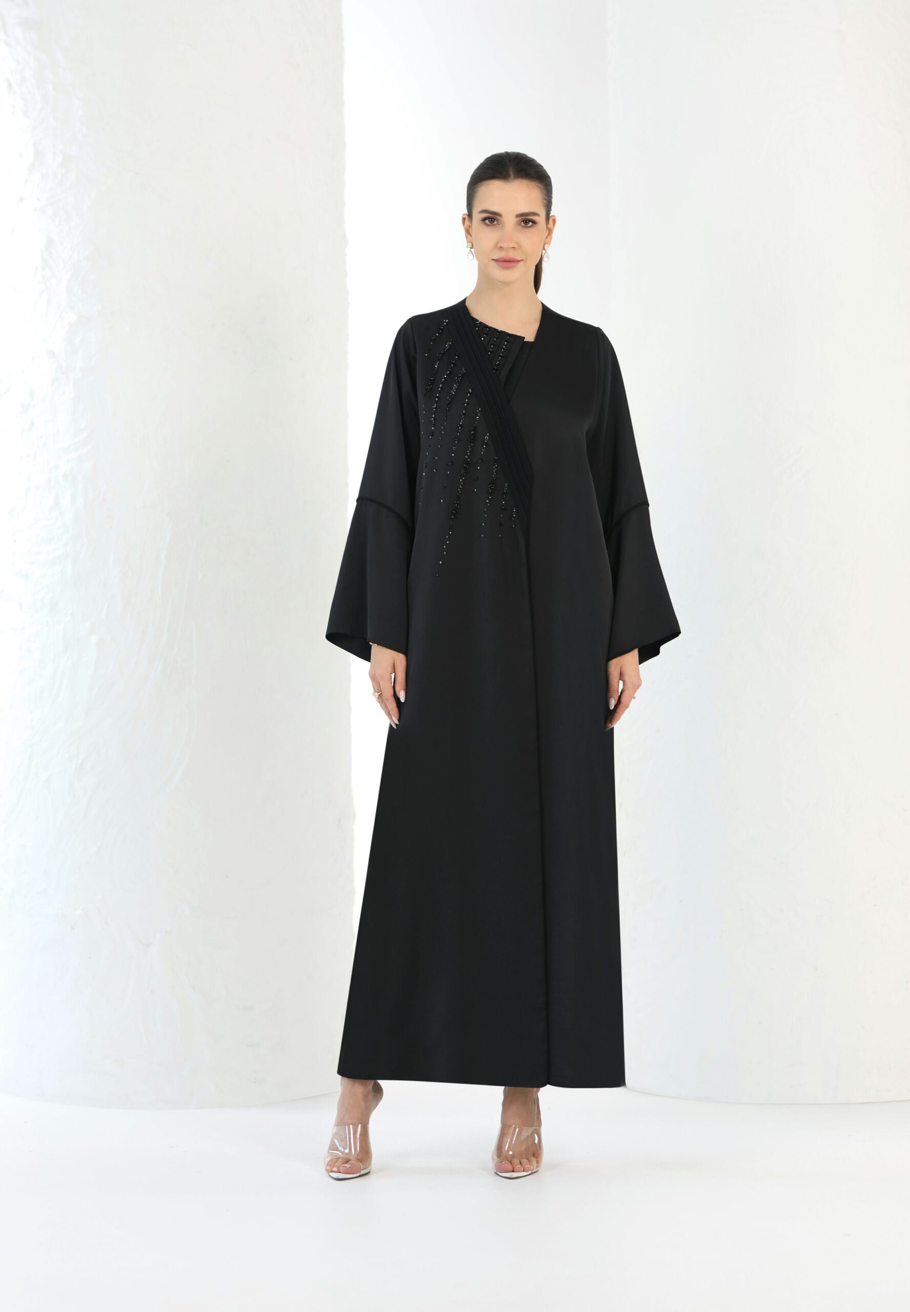 Black Abaya with Pin-tucks and Beads Embroidery, Sleeves with Piping and Little A-line shape .