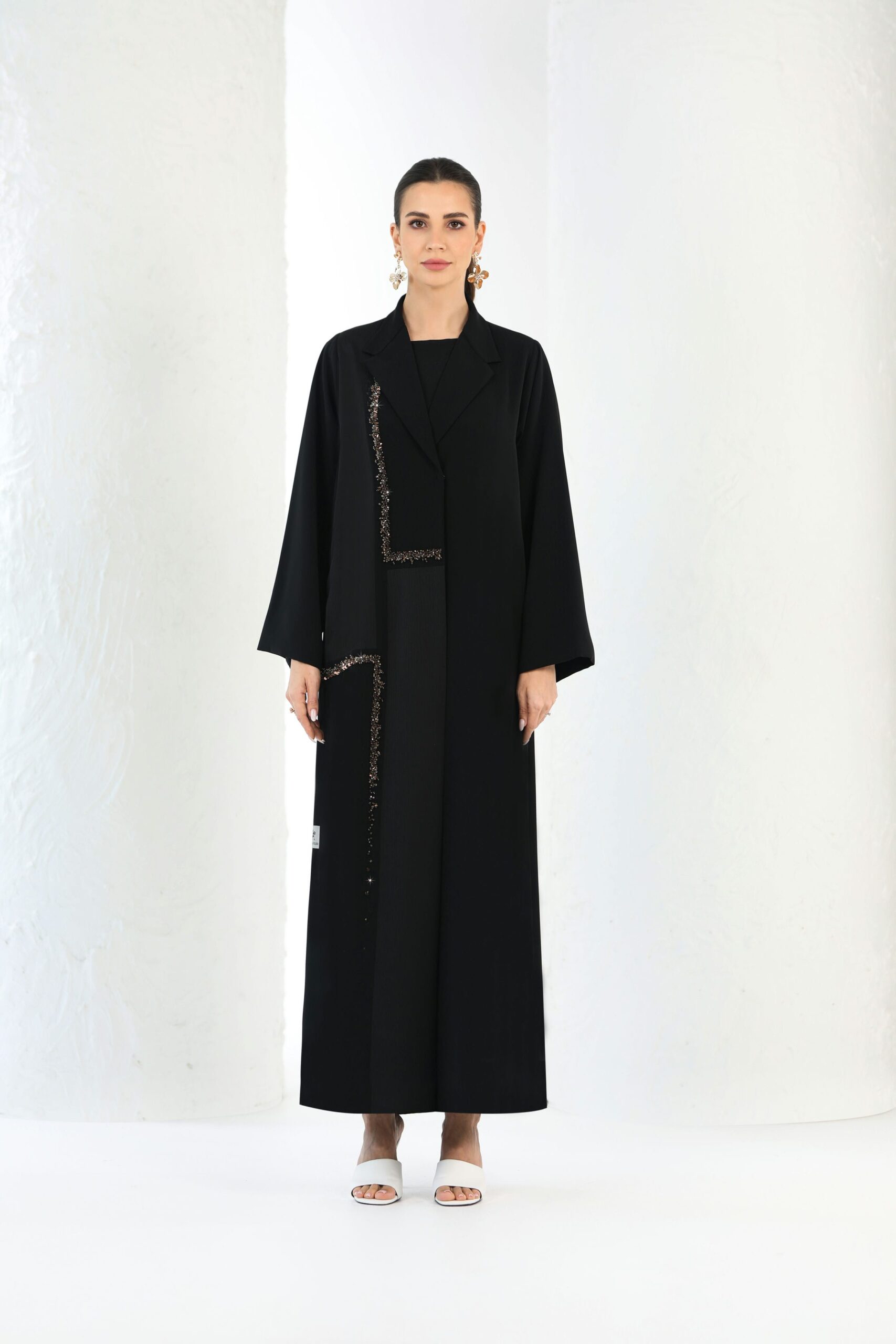 Two tone Black Abaya in Collared Design with Beads Embroidery at the Right Front.