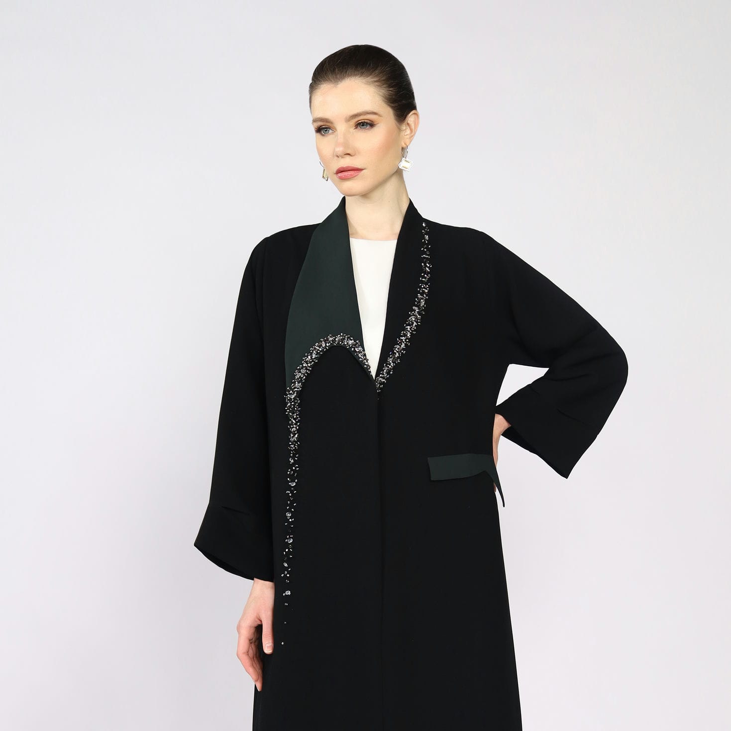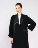 Black abaya with dark green collar design and hand embroidery crystals on front and one side pocket.