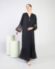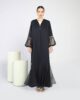 Black abaya with organza layers on front and bell design sleeves with hand embroidery crystal.