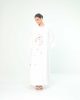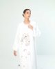 Off-white, V-neck abaya with intricate fabric flower applique adorned with beadworks scattered in front giving it an elegant feminine touch.
