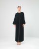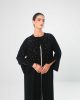 Black, round neck abaya with pleated fabric panel and scattered polka-dot fabric applique embroidery for a bold modern flair.