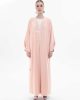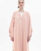 This sophisticated open abaya in a soft dusty rose features a clean collarless round neckline and is beautifully embellished with delicate pearls and off-white embroidery in a vine motif along one side of the bodice.