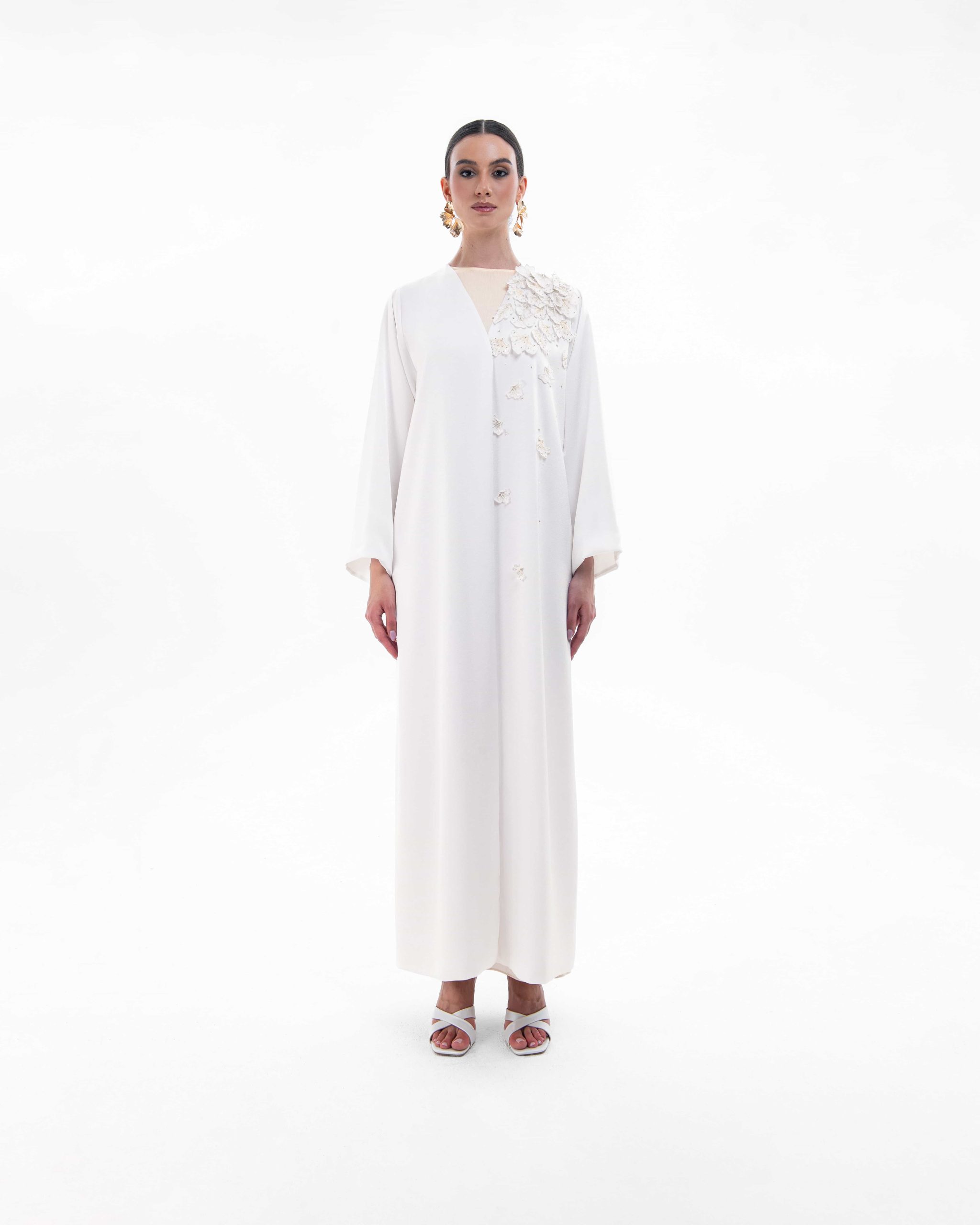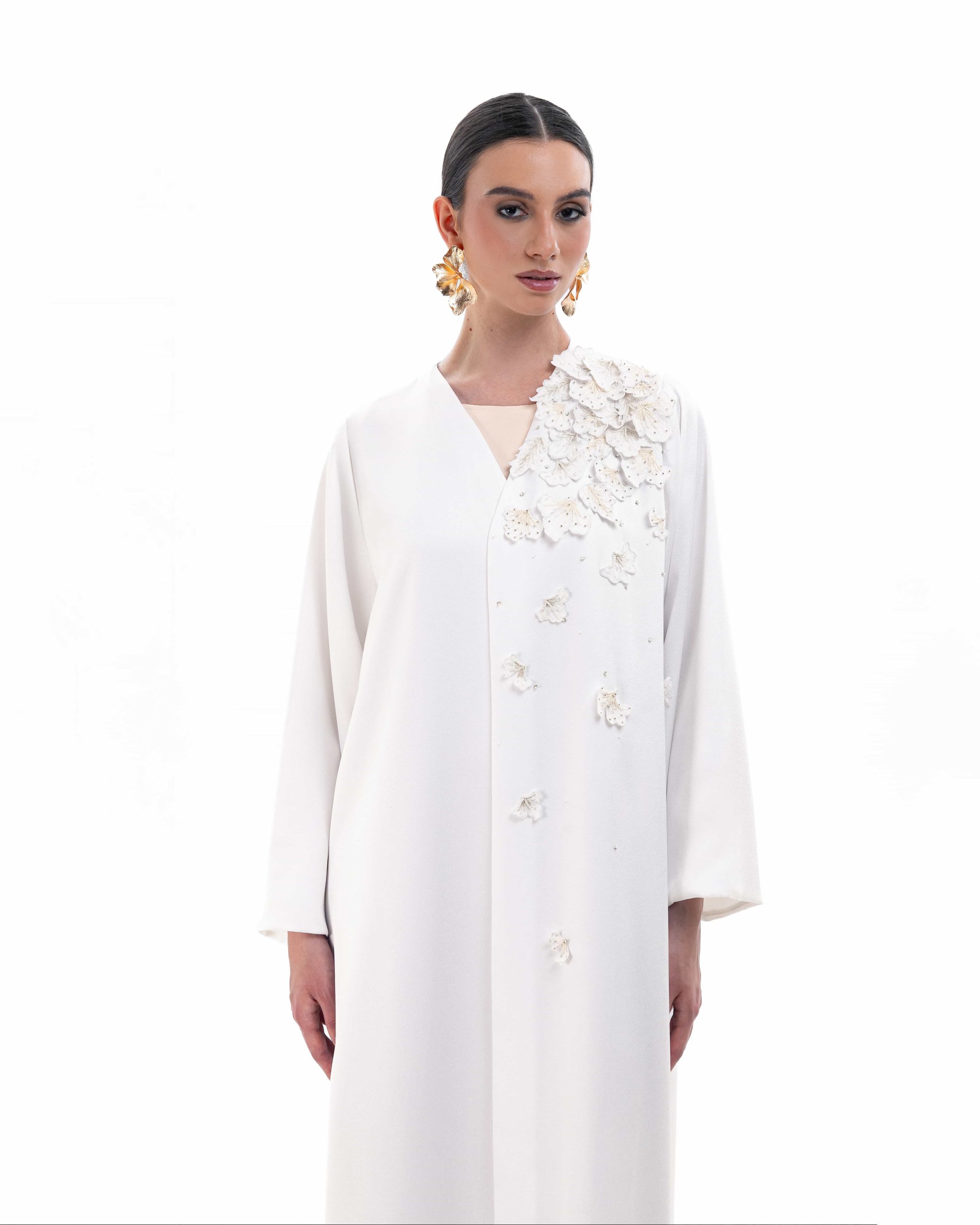 This pristine white abaya showcases a contemporary V-neckline with a subtle contrasting inner panel, intricate three-dimensional floral and bead embroidery gracefully positioned on the shoulder, and sleek, straight sleeves that complement the garment’s refined, floor-length column flow. (M size/ 56inches length)