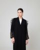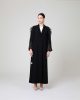 This striking black abaya features a sophisticated shawl collar and is defined by voluminous ruffled organza sleeves accented with gold geometric beadwork at the cuffs.
