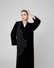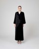 This luxurious black velvet abaya features a sophisticated V-neckline, elegant wide sleeves, and a contrasting side panel defined by shimmering black sequined and crystal embroidery.