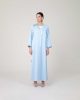 This ethereal light-blue abaya features a contemporary V-neckline and is elevated by a decorative wavy panel piping, adorned with delicate, shimmering silver embroidery and beadwork
