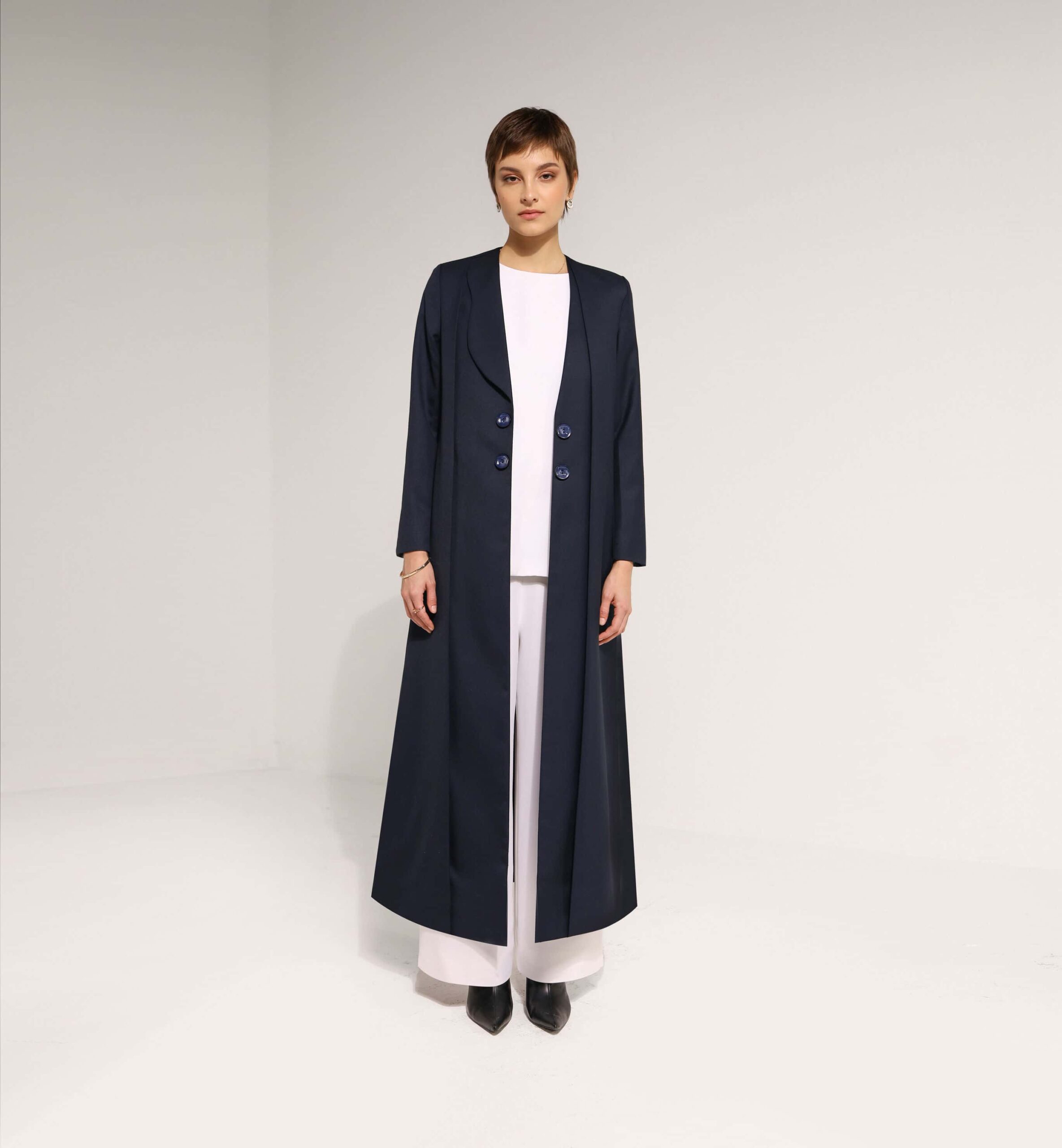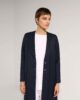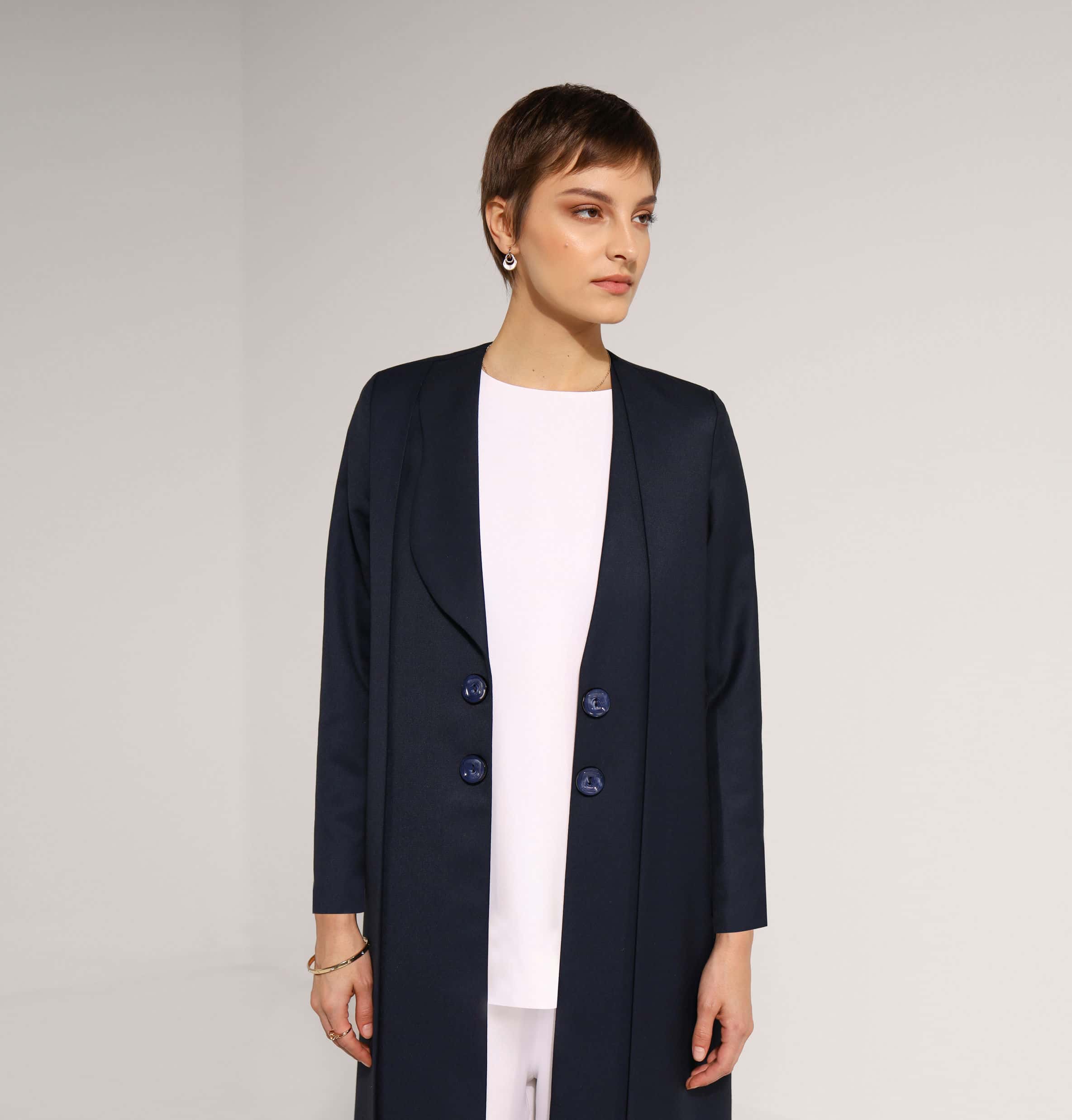 Navy-blue coat with single collar design and buttons details on front.
