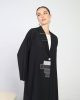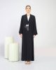 Black open-front abaya with collar, sleeves, and modern geometric patch detailing in monochrome tones, offering a sleek and contemporary silhouette.