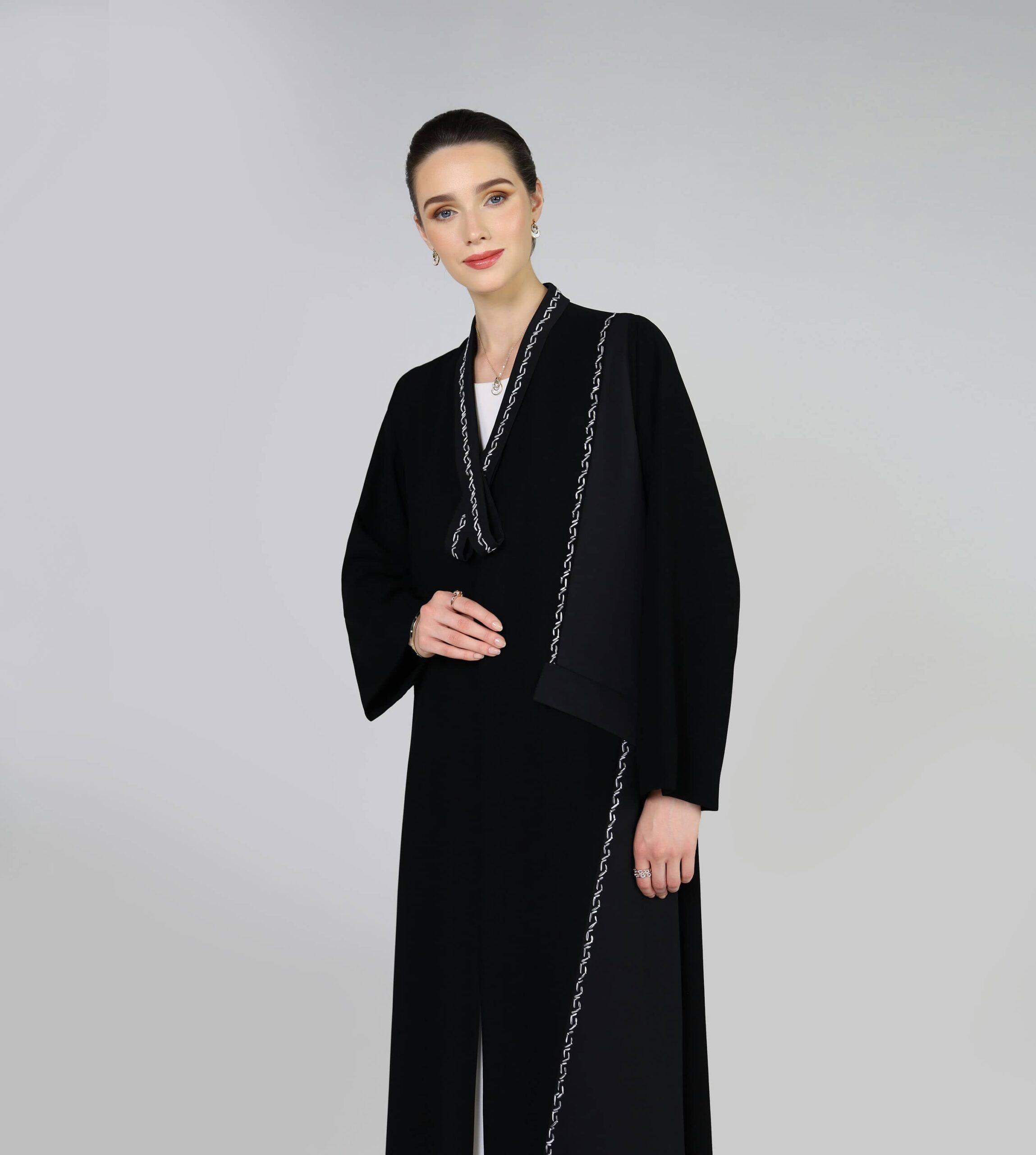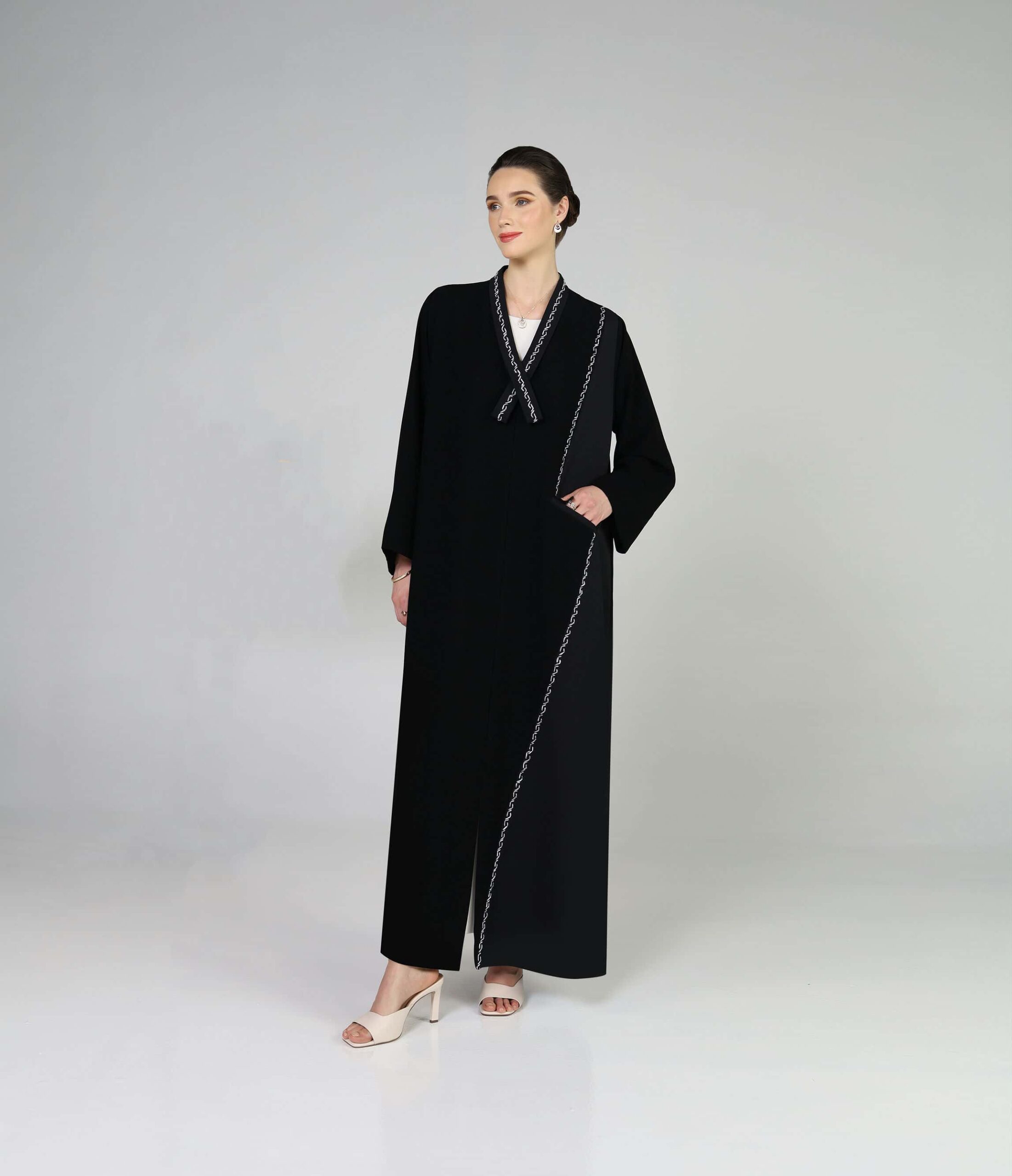 Two tone Black abaya with BOW collar design  and front pocket with hand thread embroidery details.