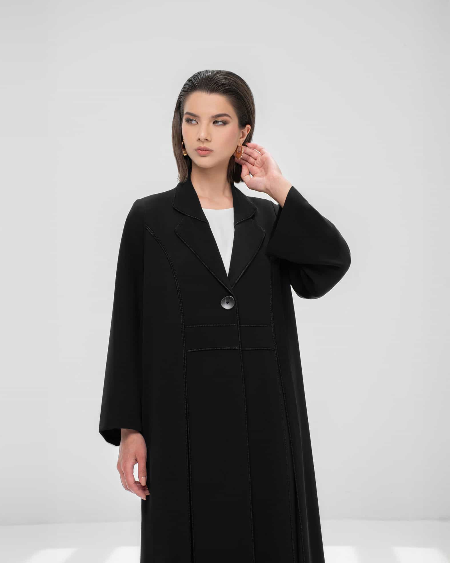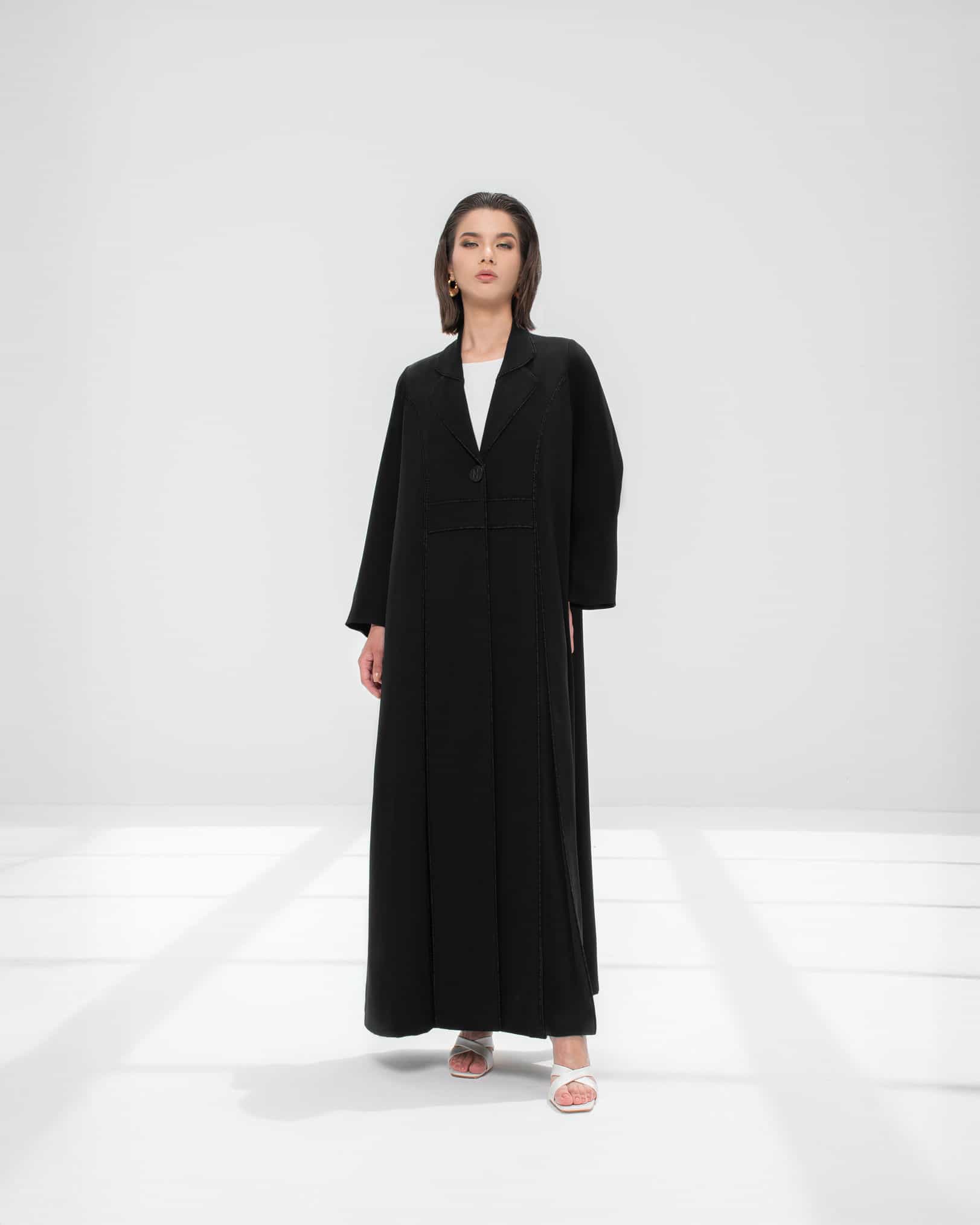Black collared abaya with piping and box pleats detail on both sides until the hem giving it a minimal and classy look.