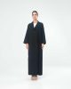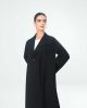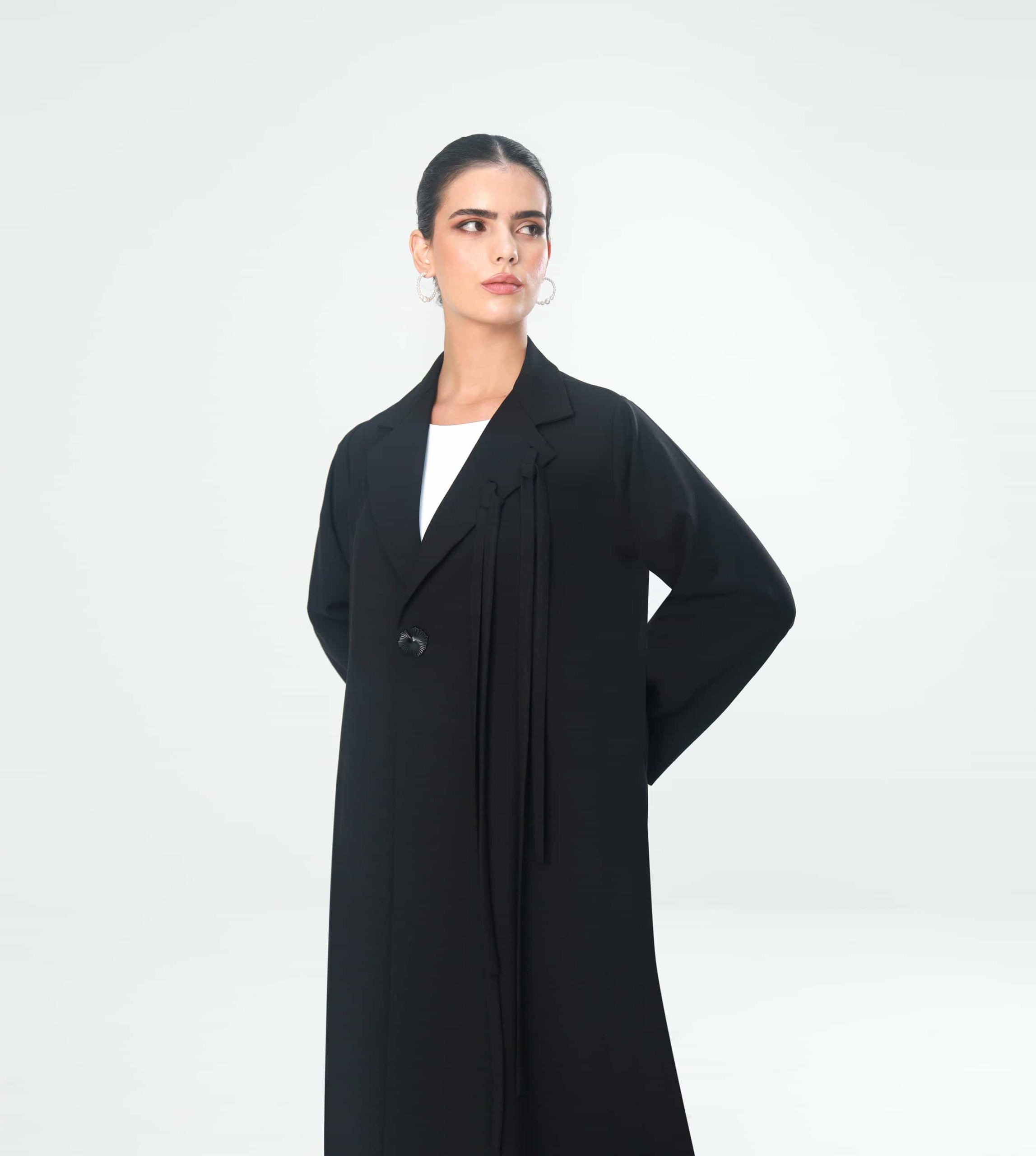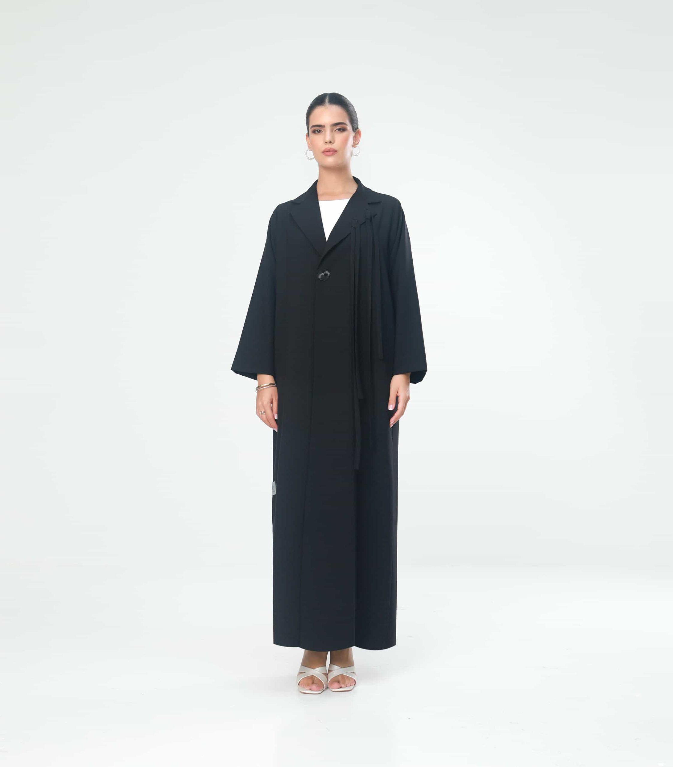 Black, Linen abaya with unique strings details on one side of the collar for a clean, sleek look.