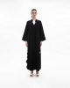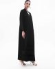 Black abaya featuring a sleek band collar neckline, wide straight sleeves, and distinctive textured circular appliqué detailing along the lower side for a modern, artistic touch.