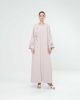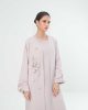 Soft beige hue abaya, a modest round neckline, delicate 3D floral appliqué detailing on the front, and elegant long draped sleeves with subtle gathered accents.
