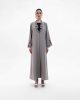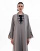 This understated light taupe abaya features a contemporary deep neckline with a shawl-like collar, exquisite lace appliqué detailing the neckline and the flared cuff openings, all complemented by its long, straight sleeves.