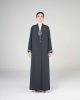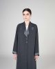 This elegant charcoal grey abaya features a sharp notched collar with contrasting silver-toned satin inserts and two ornate decorative buttons for a tailored, professional aesthetic.