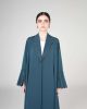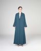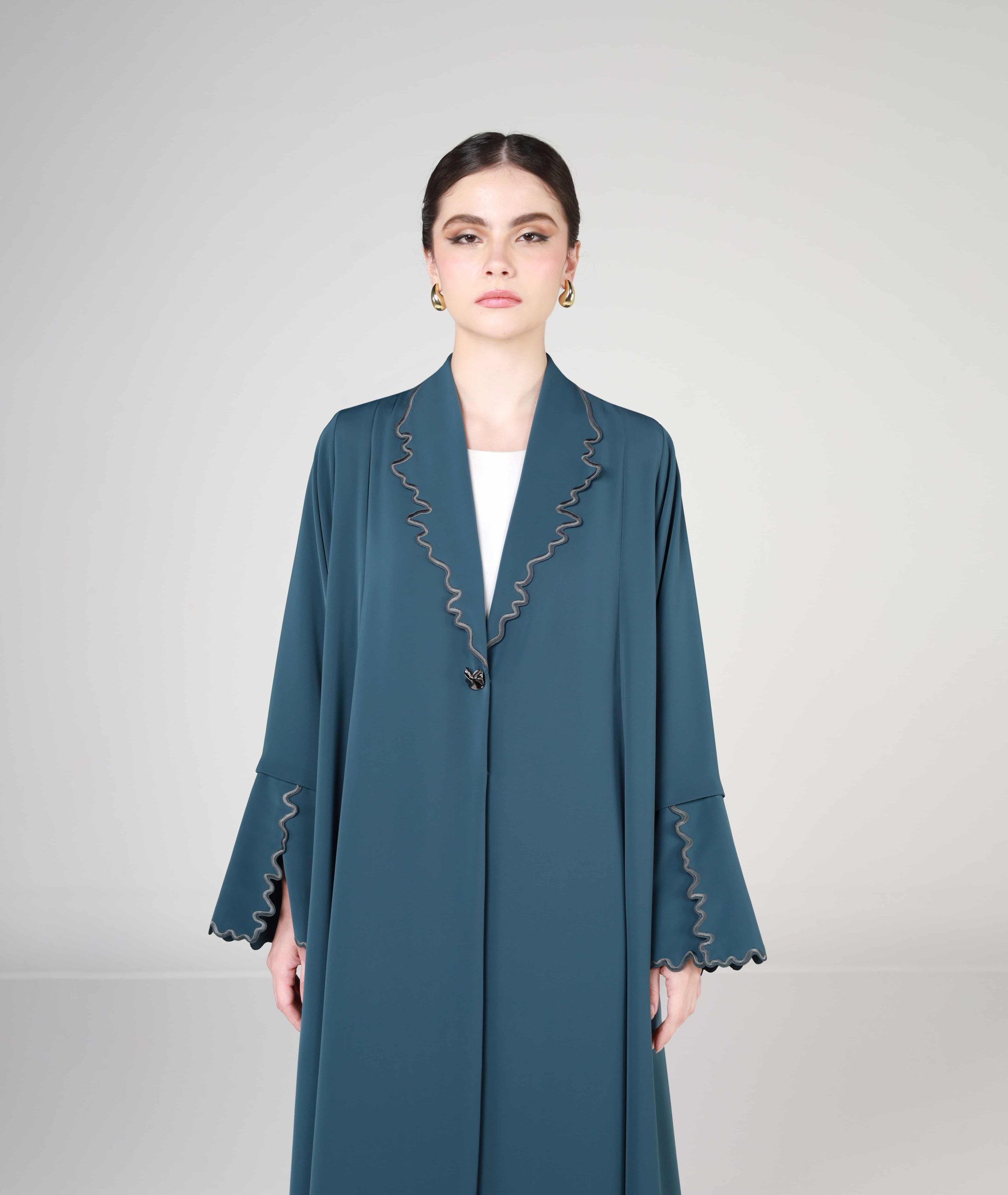 This sophisticated teal abaya features a structured collar neckline and slitted cuffs, both accentuated with an elegant wavy-edged trim and a single decorative button closure.
