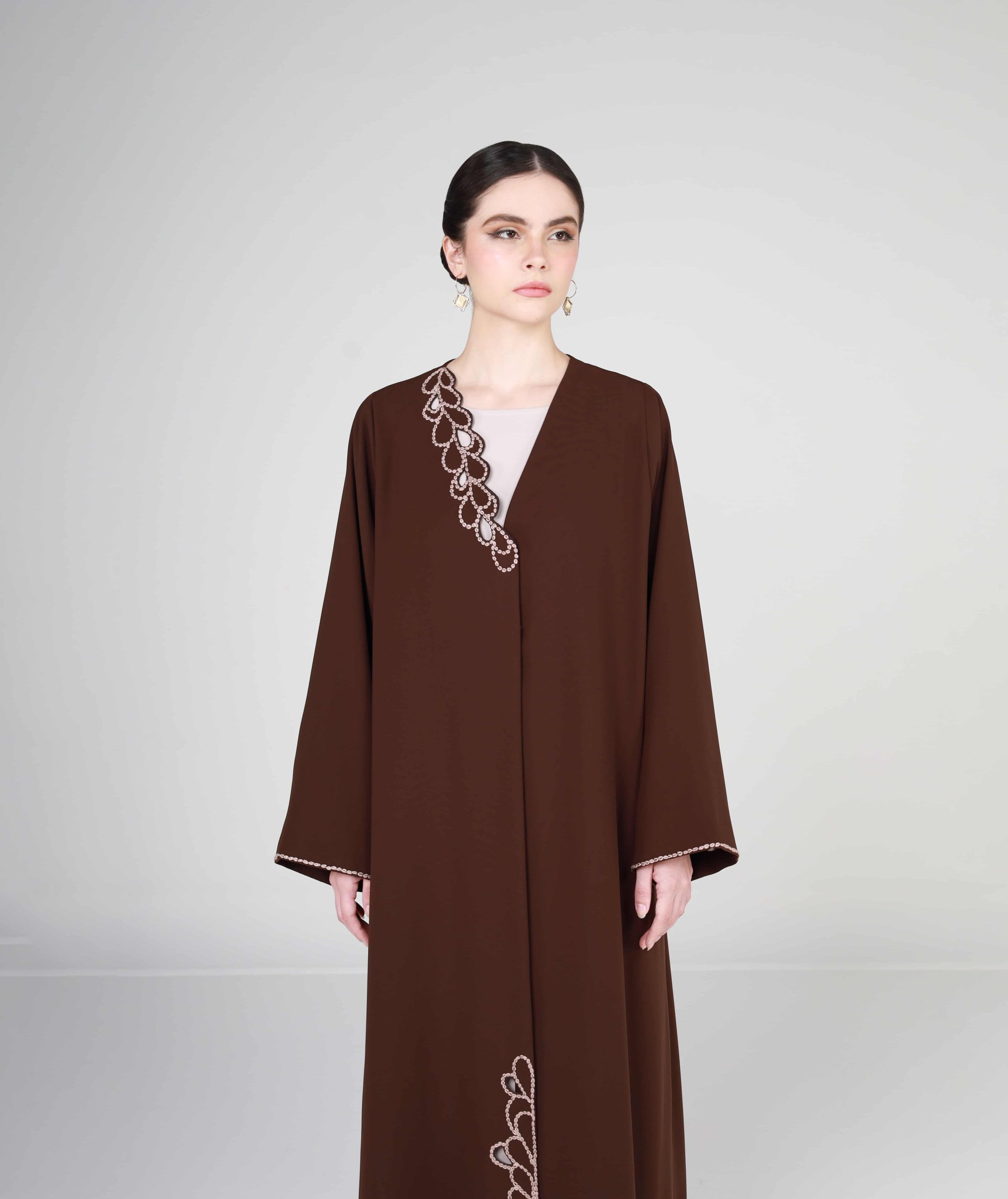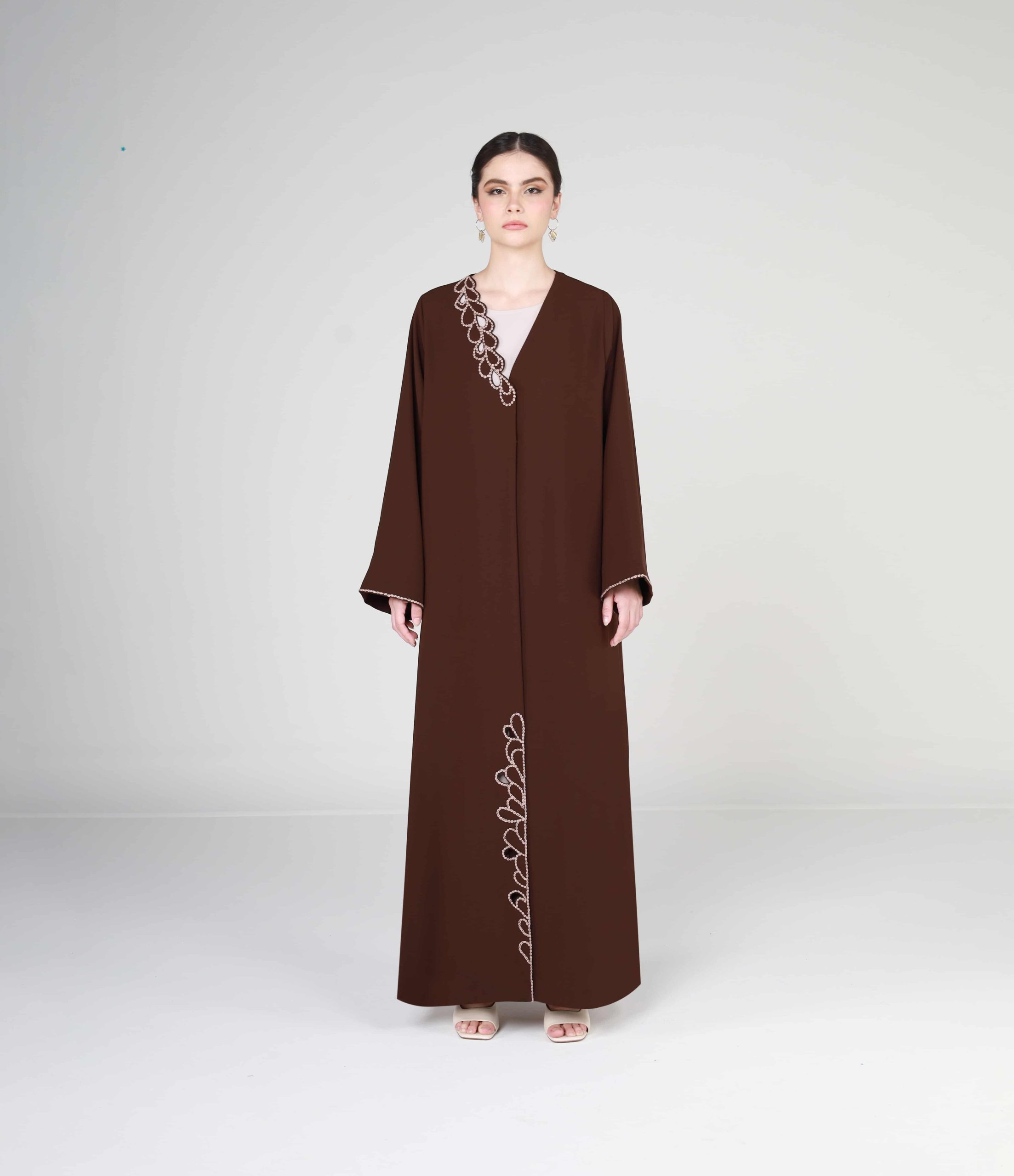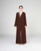 This rich chocolate brown abaya features an elegant V-neckline and is beautifully detailed with intricate teardrop embroidery and delicate fabric cut-out along the collar and bottom.