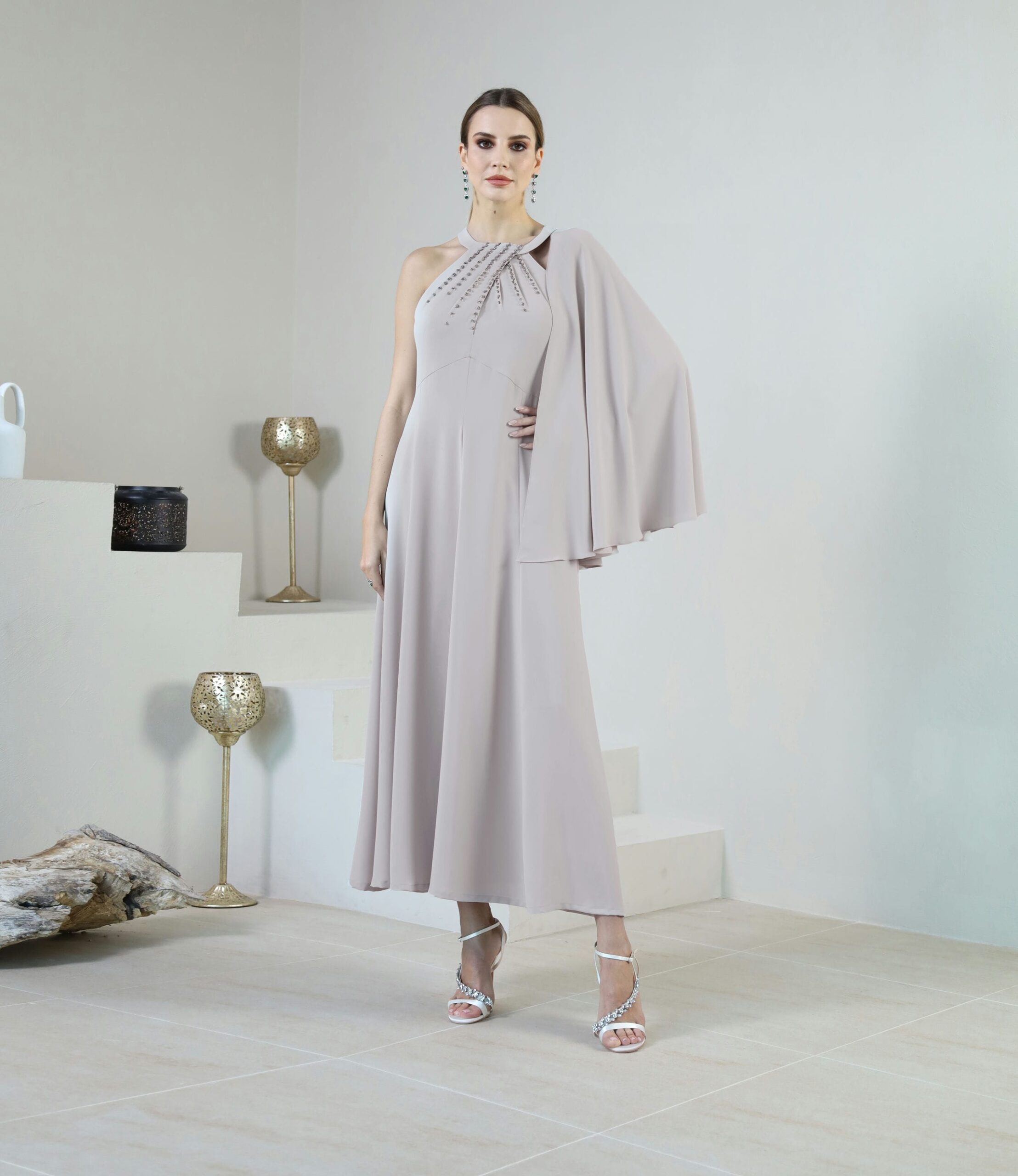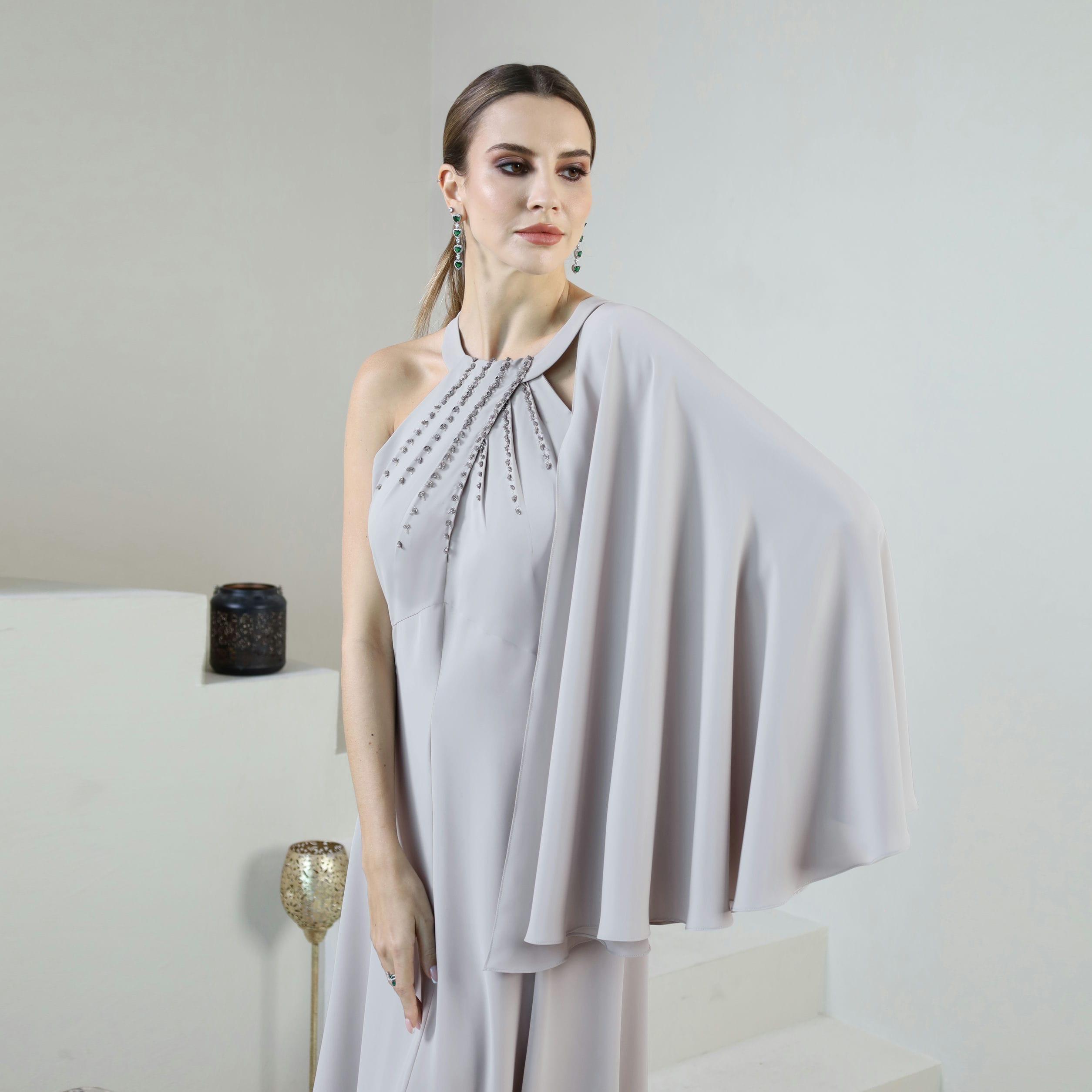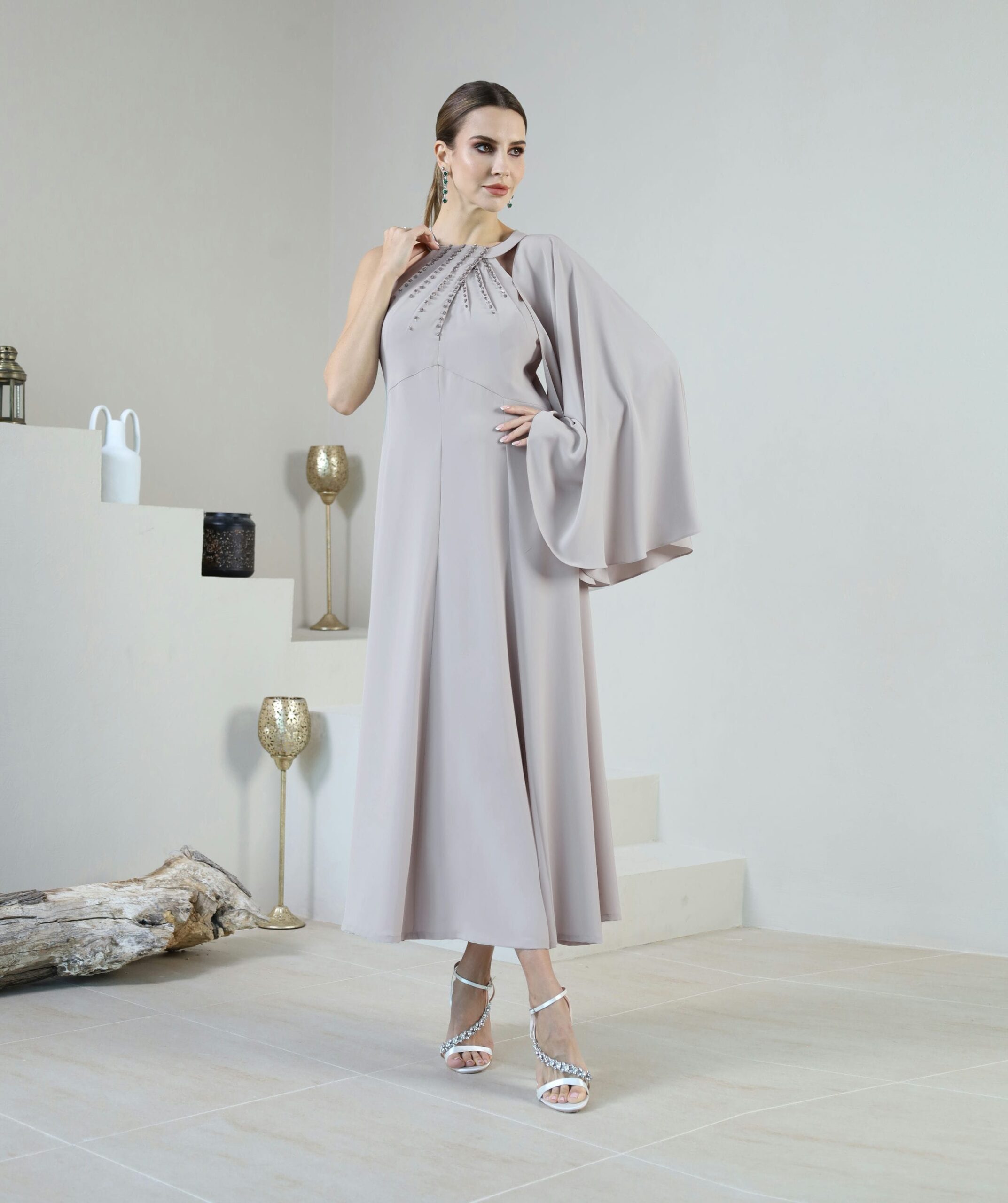 Light beige Kaftan with one flutter shoulder style and beads embroidery on front