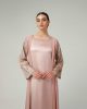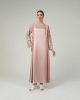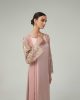 Blush pink satin kaftan with straight cut and embellished lace sleeves, featuring a layered panel design and delicate neckline detailing.