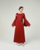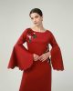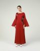 Deep red kaftan featuring layered bell sleeves and floral applique embroidery along the bodice, with a straight-cut hem.