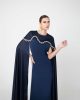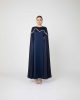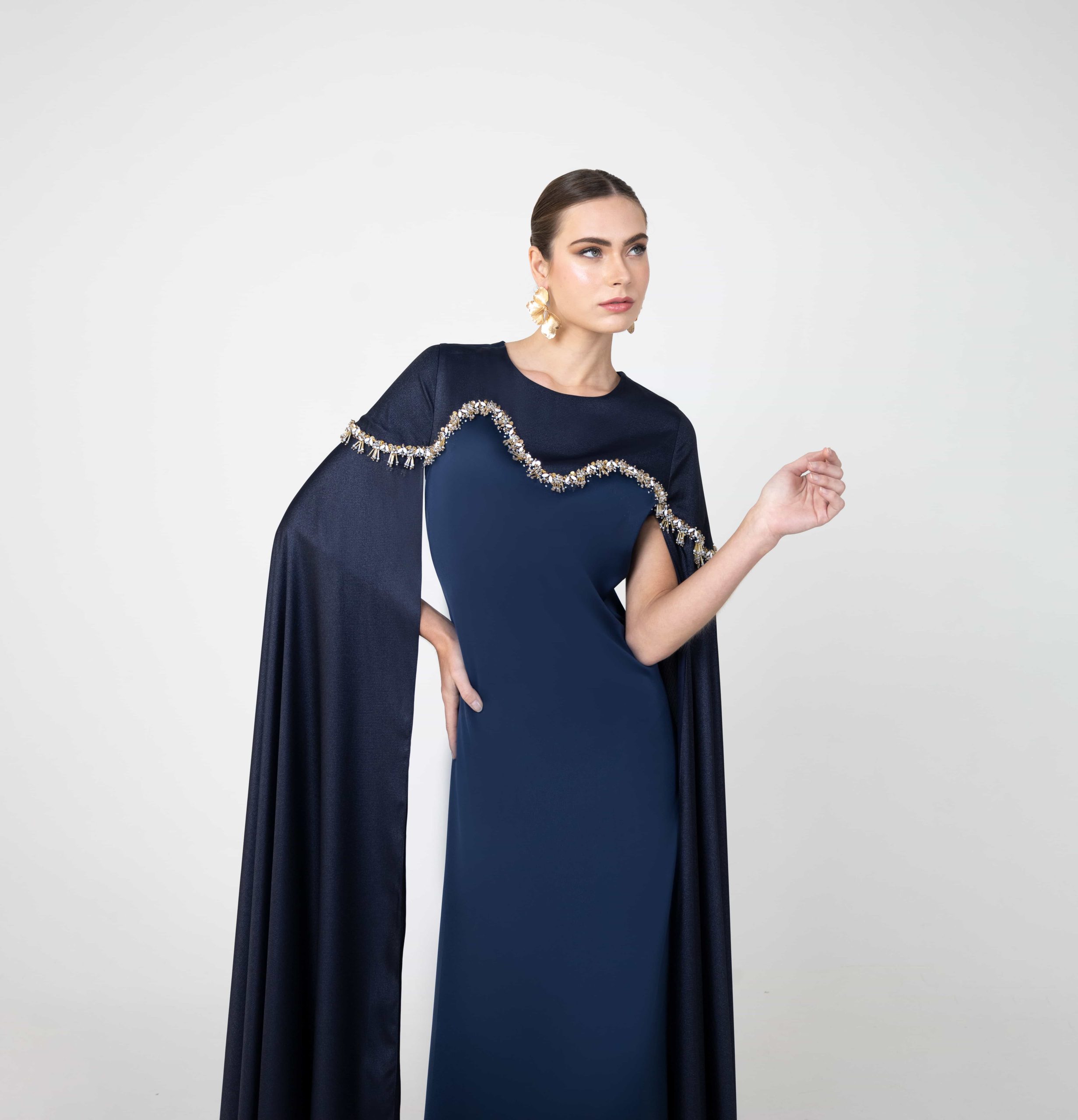 This deep-navy kaftan features a modest round neckline and a dramatic floor-length cape sleeve, elegantly detailed with a shimmering wave of gold and silver crystal embroidery across the chest.
