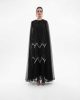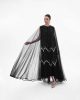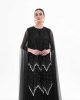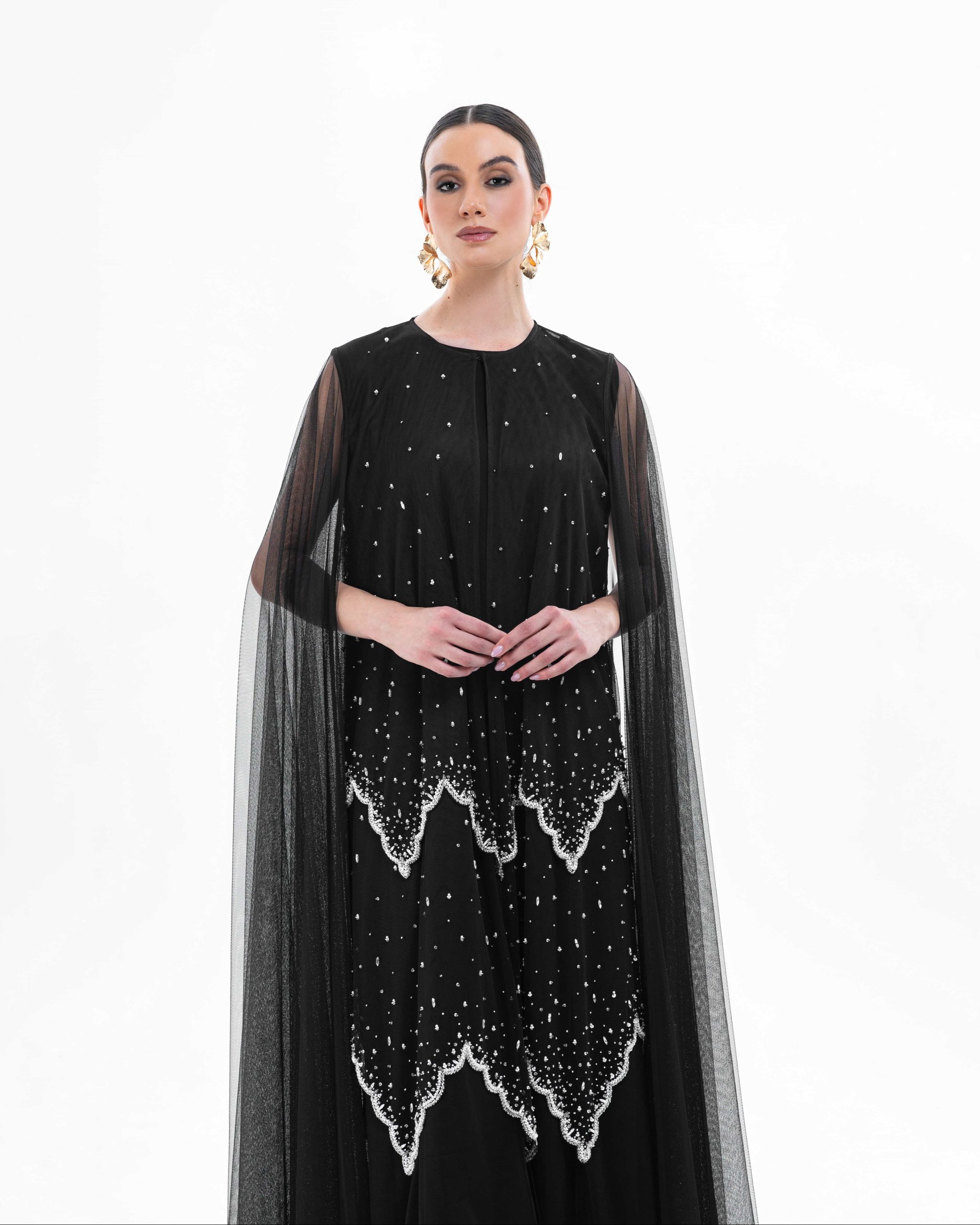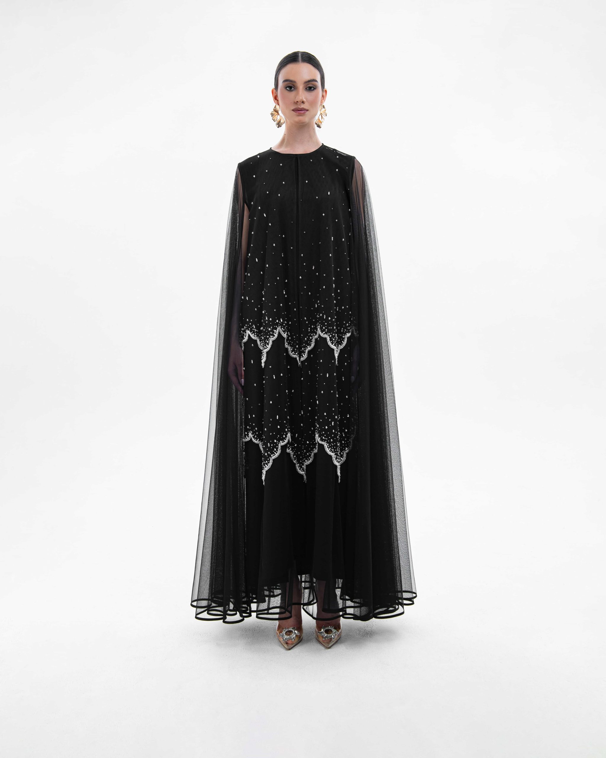 This majestic wedding abaya features a simple round neckline, breathtaking cascading white scalloped embroidery adorned with sparkling embellishments, and sheer, flowing floor-length cape sleeves that create an exceptionally dramatic silhouette.
