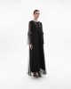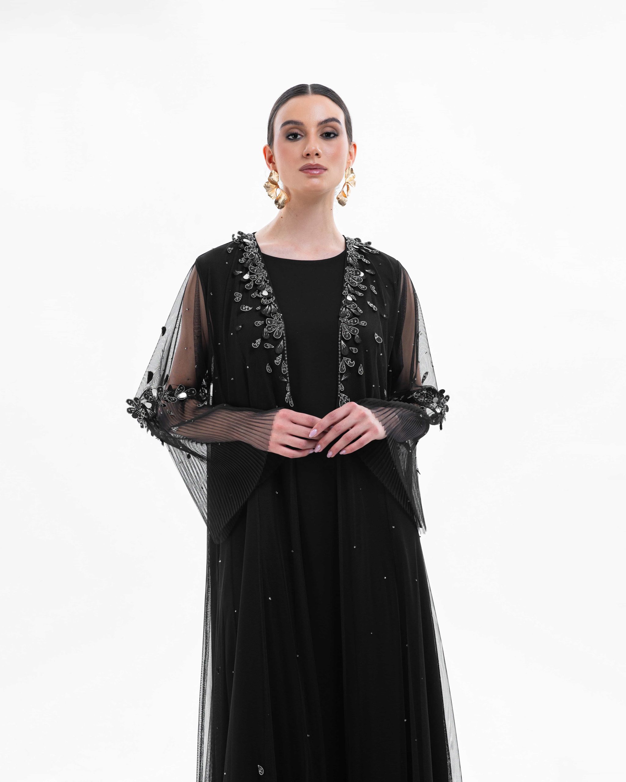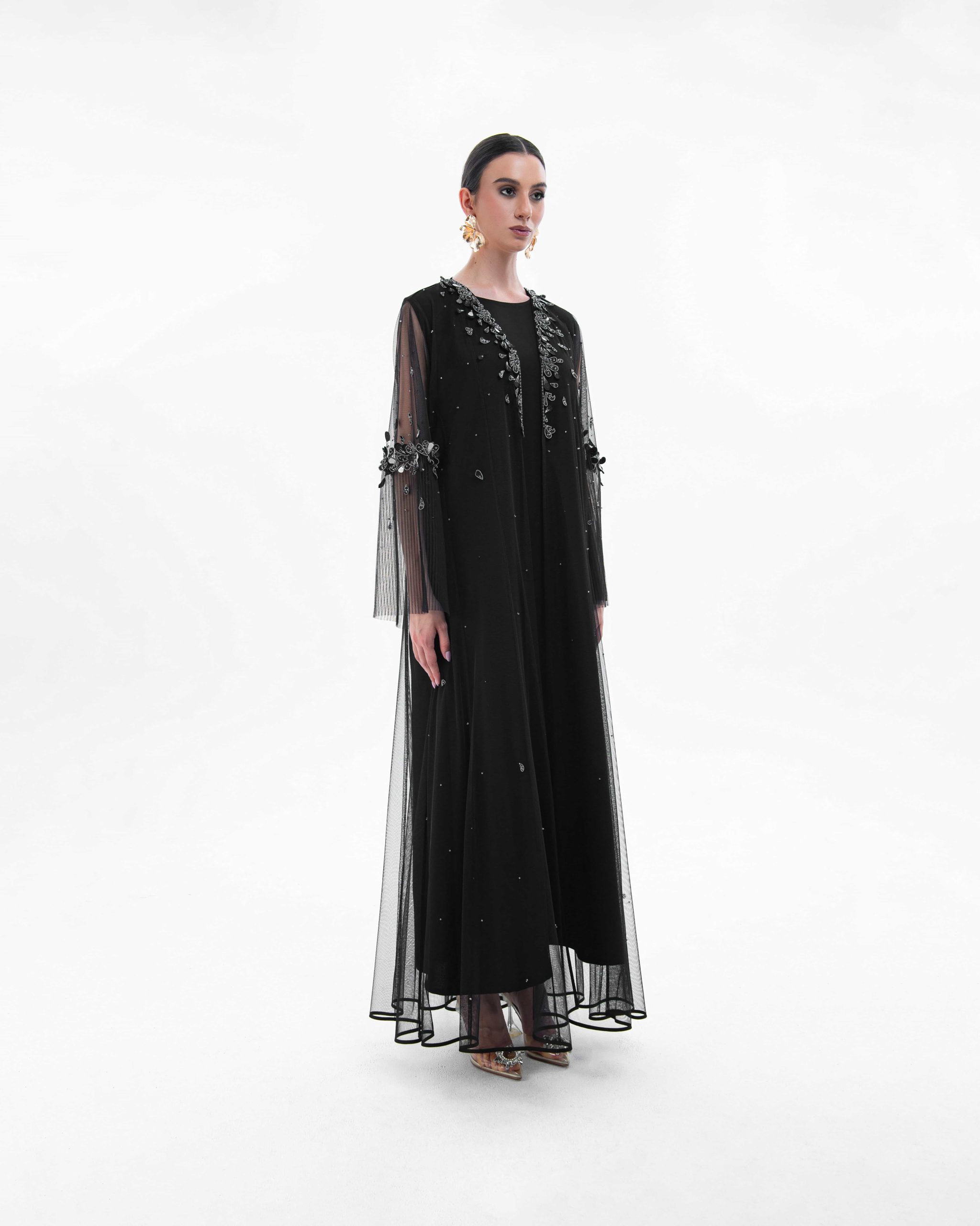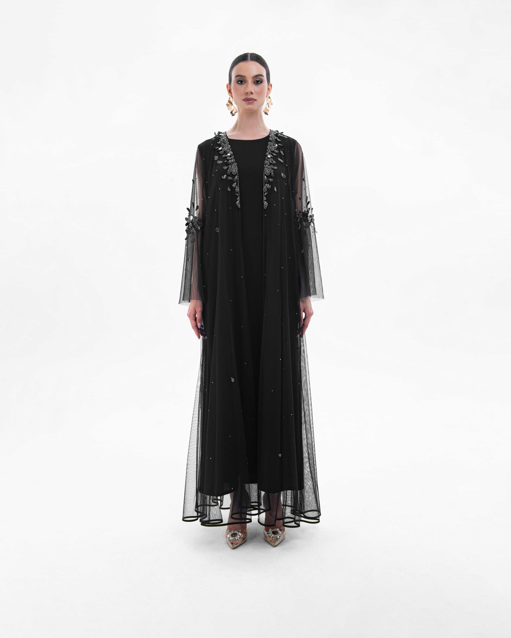 This sophisticated open abaya features a collarless neckline, exquisite three-dimensional floral and beaded embroidery concentrating on the bodice, and long, dramatically flared sheer tulle sleeves that contribute to its elegant, flowing silhouette.